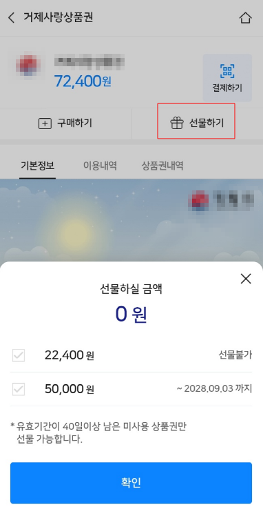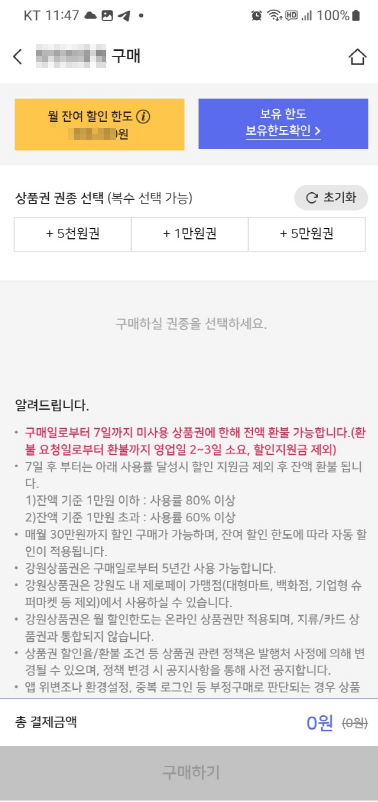 ✔️ 1인당 할인한도 4만원이므로 20만원어치 상품권을 구매하면 할인한도는 채웁니다. 부족하면 다른 가족이 구매해서 선물하기 하면 됩니다.