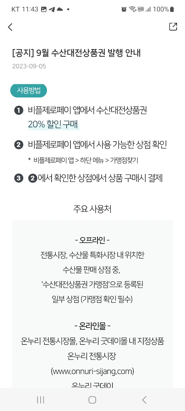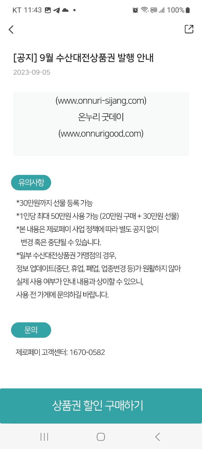 ✔️ 수산대전 상품권을 클릭하고 들어가면 행사안내문이 나오고 제일 밑으로 내리면 상품권구매하기 버튼이 있습니다.