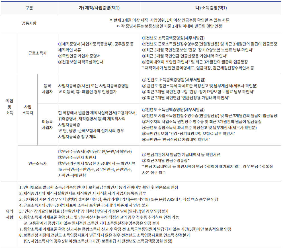 준비서류는 아래와 같습니다. 3개월 이상 재직, 사업영위(또는 1회 이상 연금수령) 확인을 위해 재직, 사업증빙 및 소득증빙 서류가 필요하며 주민등록증 등 실명확인증표는 공통입니다.